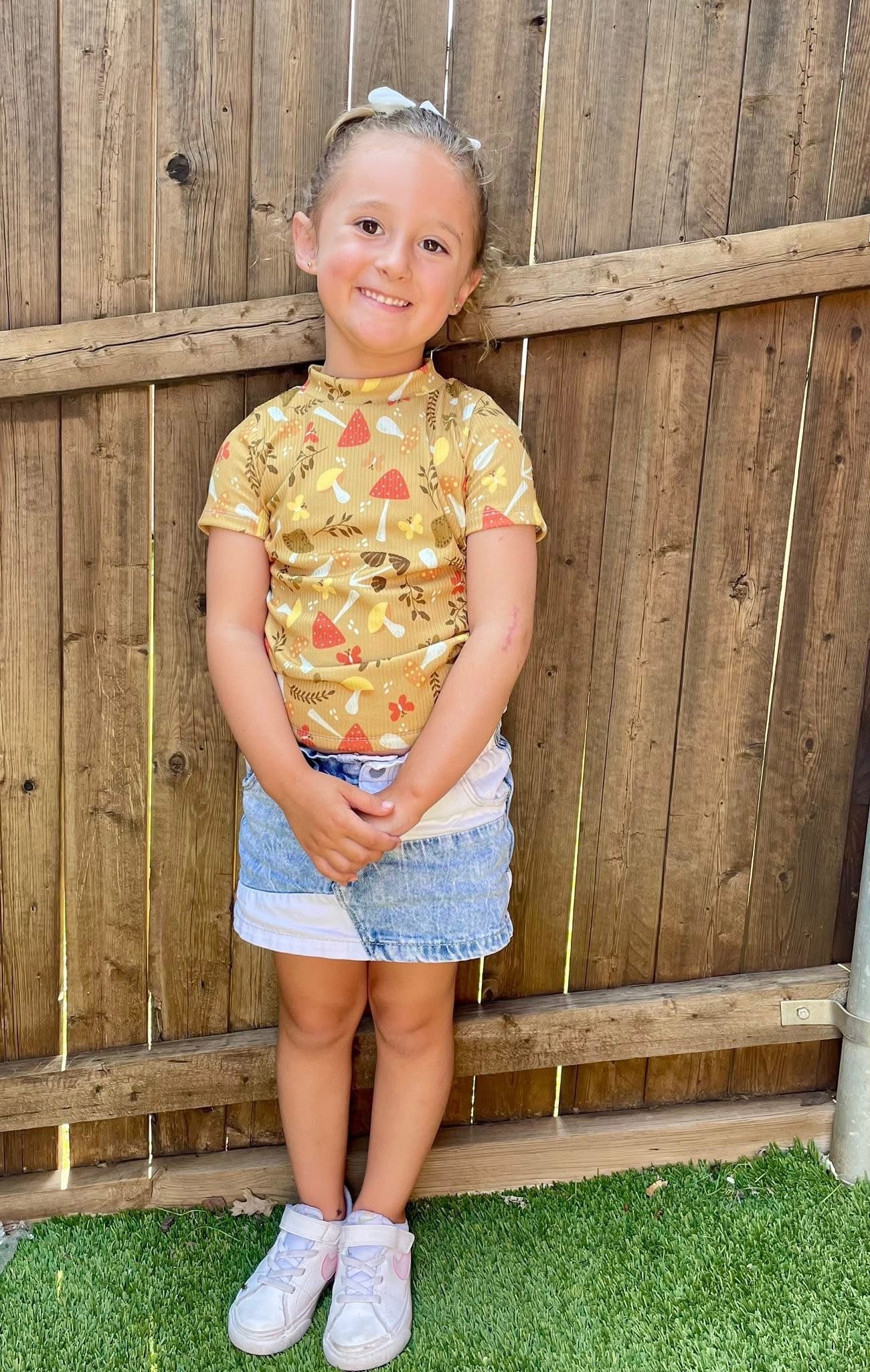 This top has a modest crop compared to our Basic Tee. It is a little more fitted with a slightly thicker neckband as well.